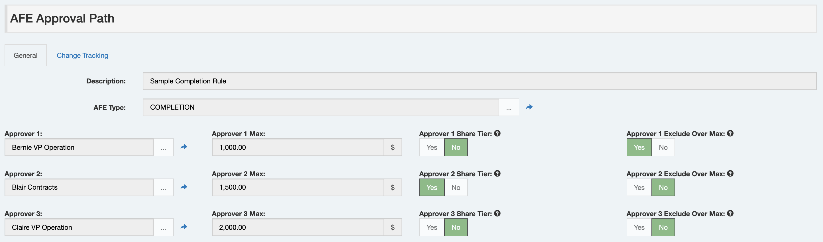 Here is a sample Approval Path that defines a three-approver approval path for completion AFEs.