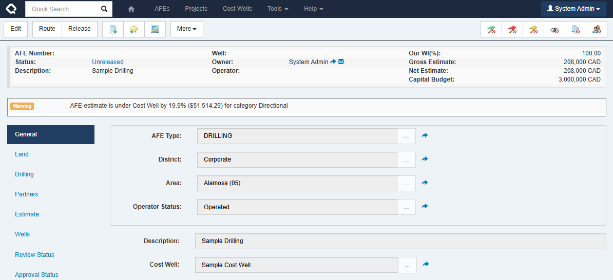 - For an AFE, the GL accounts are mapped to Cost Well Categories. Then, you can link a Cost Well to your AFE and validation messages appear if the AFE’s estimate is under or exceeds the costs in the Cost Well.