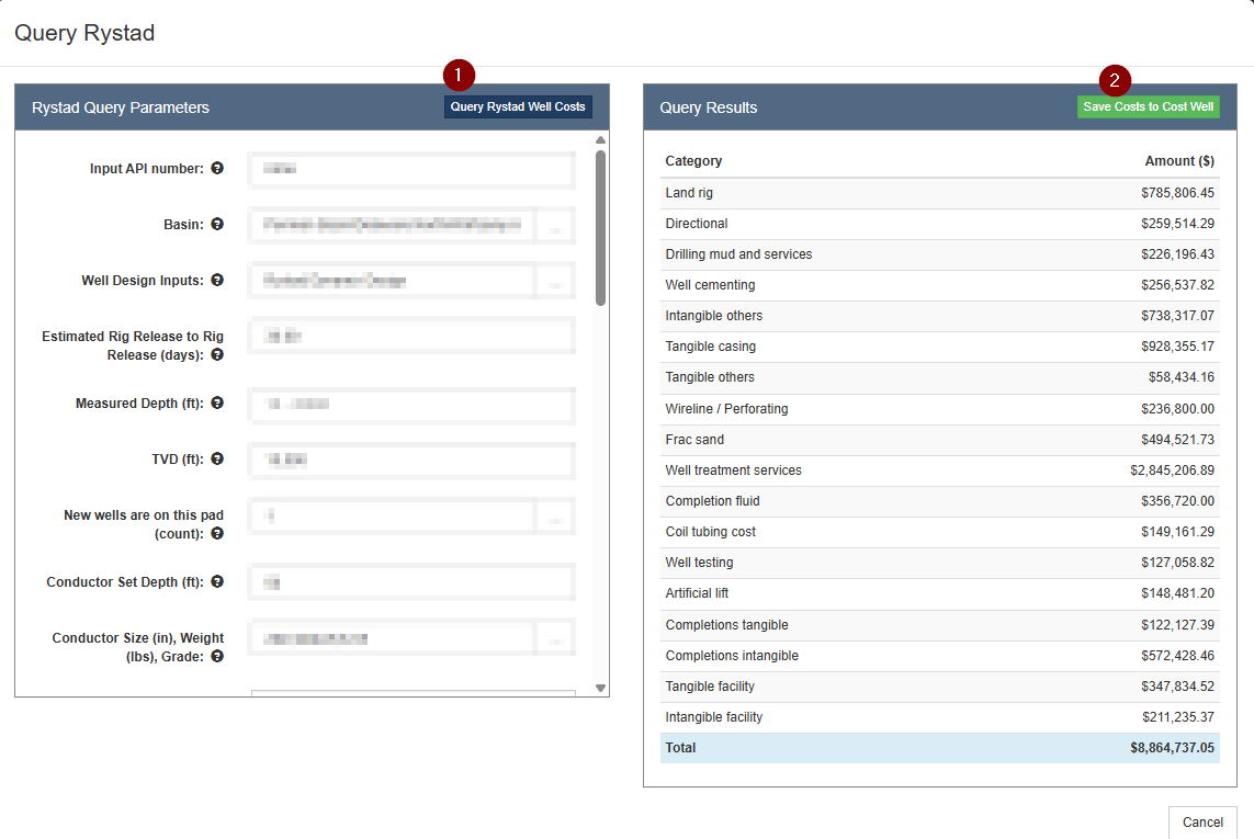 The input parameters used for the query and the resulting costs are written to tables on the Cost Well. The costs are organized in categories that we refer to as Cost Well Categories.